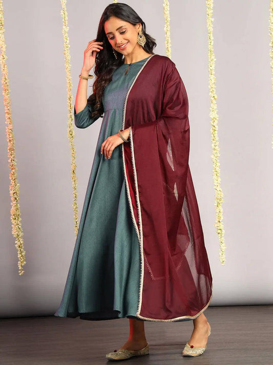Teal Rayon Solid Kurta with Dupatta