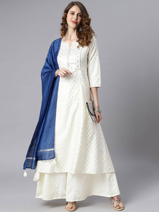 Off- White Poly Silk Ethnic Motifs Kurta with Palazzo and Dupatta