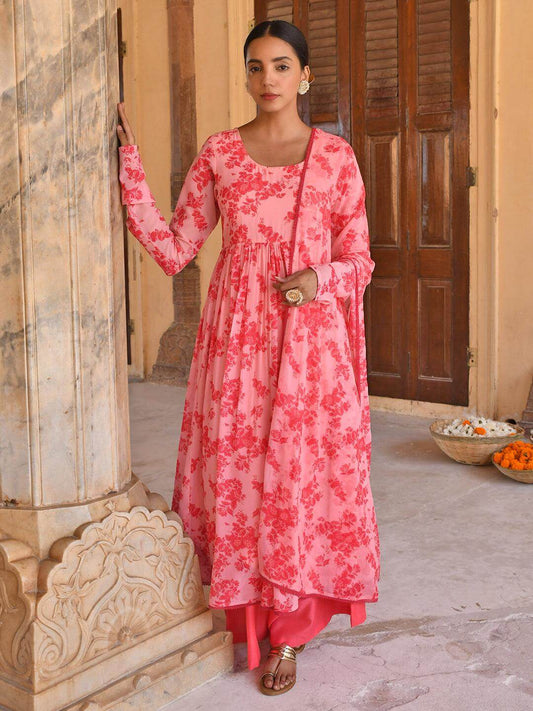 Pink Georgette Floral Print Kurta with Flared Palazzo and Dupatta