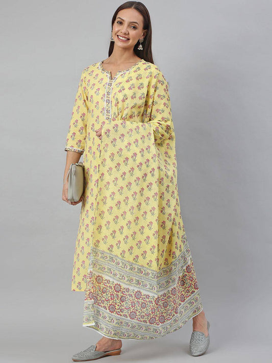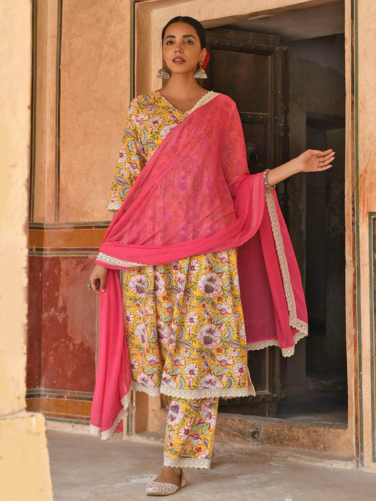 Yellow Cotton Floral Print Kurta with Pant and Dupatta