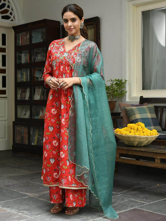 Red Cotton Floral Block Print Kurta with Palazzo and Dupatta