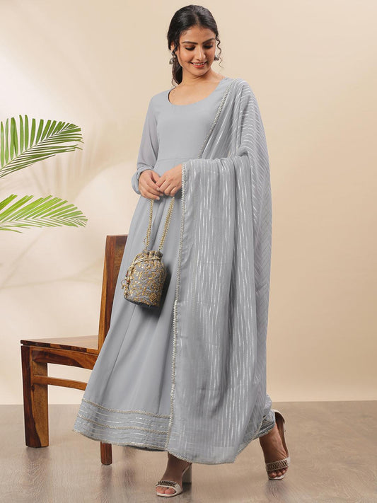 Grey Poly Georgette Solid Kurta with Dupatta