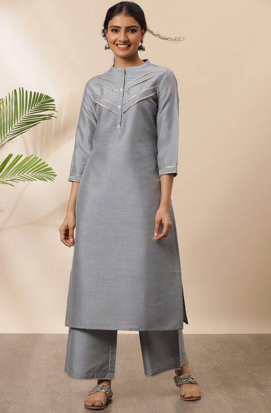 Grey Poly Silk Solid Kurta with Palazzo