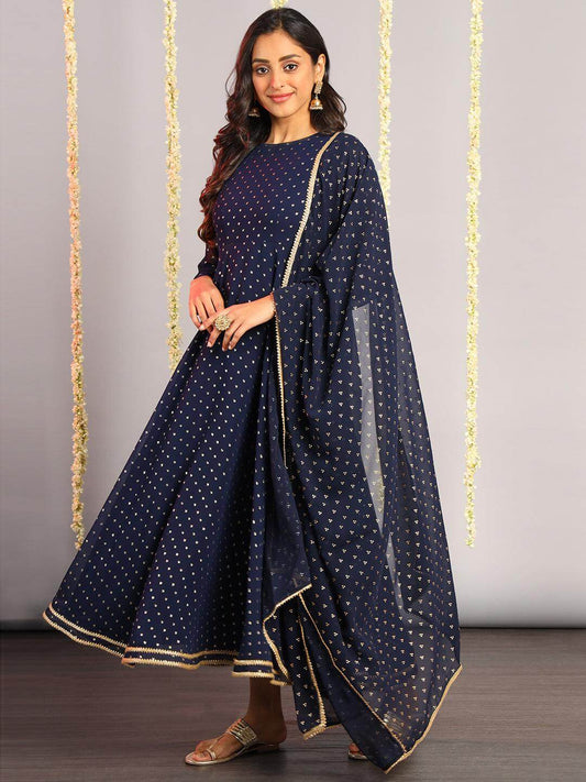 Navy Blue Poly Georgette Foil Print Kurta with Dupatta