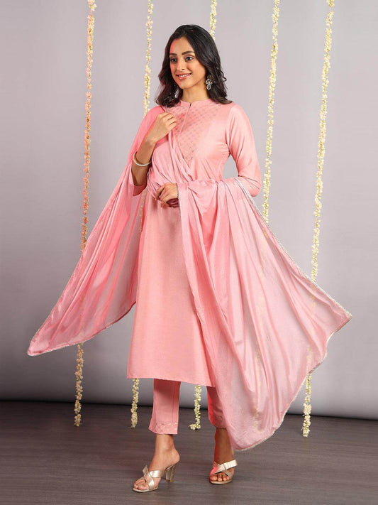 Pink Poly Silk Floral Print Kurta with Pant and Dupatta