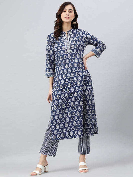 Navy Blue Cotton Embroidered Kurta with Pant
