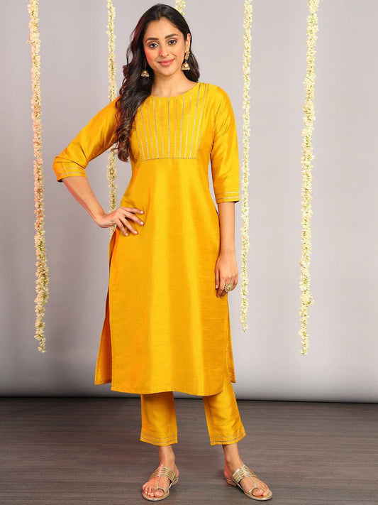 Mustard Poly Silk Solid Kurta with Pant