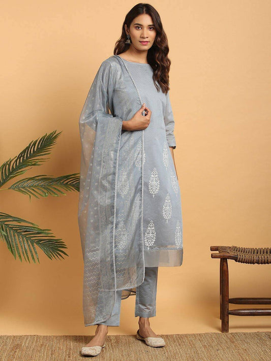 Grey Poly Chanderi Ethnic Motifs Kurta with Pant and Dupatta