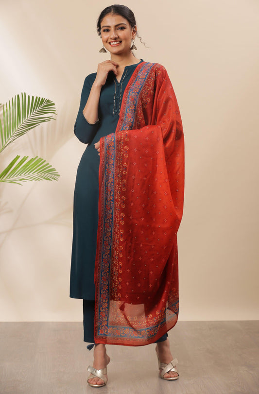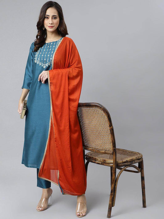 Teal Rayon Solid Kurta with Pant and Dupatta