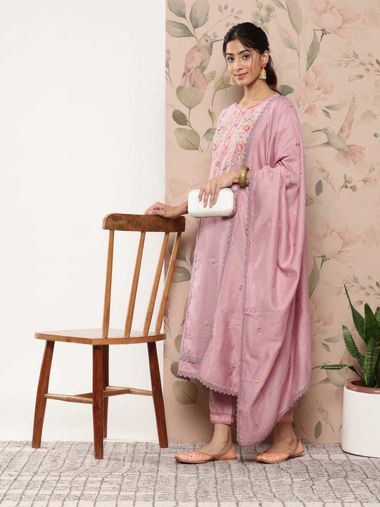 Mauve Poly Silk Floral Embroidery Kurta with Pant and Dupatta
