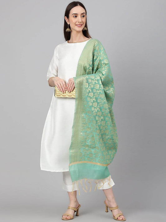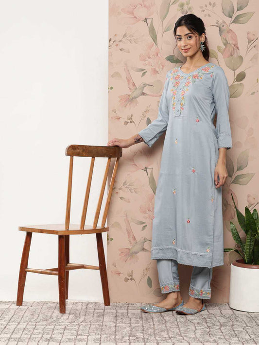 Mint Blue Poly Silk Floral Embroidery Kurta with Pant and Dupatta