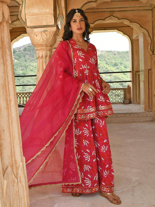 Pink Cotton Floral Block Print Short Kurta with Gharara and Dupatta
