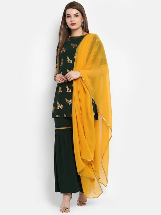 Dark Green Poly Crepe Gold Print Kurti with Sharara and Dupatta