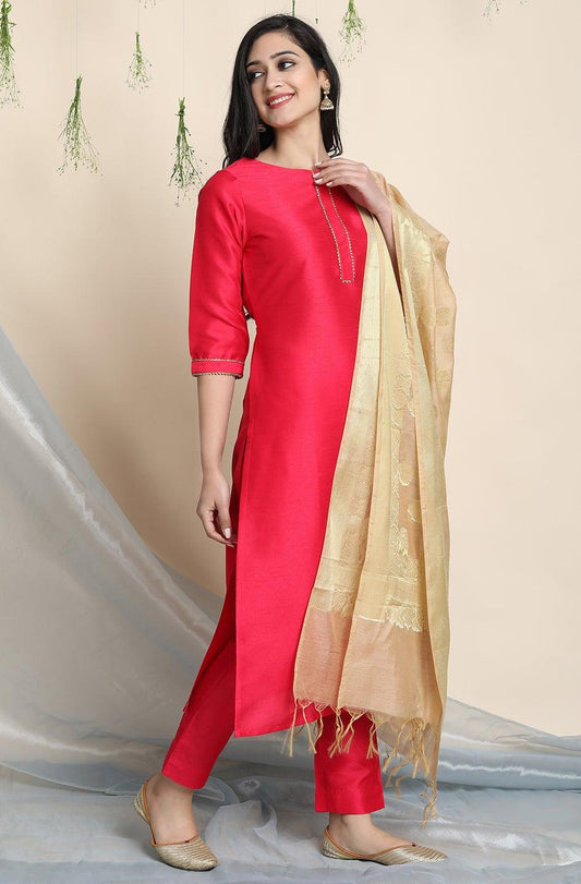 Pink Poly Silk Solid Kurta with Pant and Dupatta