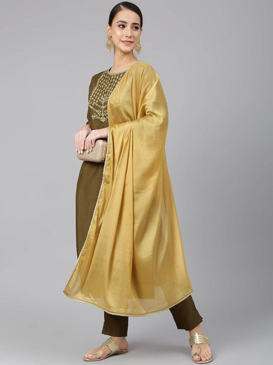 Olive Poly Silk Solid Kurta with Pant and Dupatta