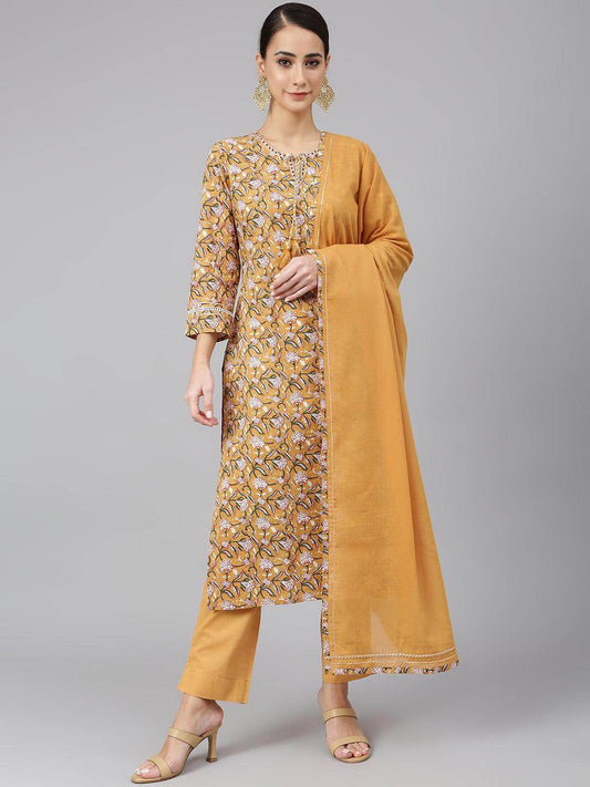Light Brown Cotton Floral Print Kurta with Pant and Dupatta