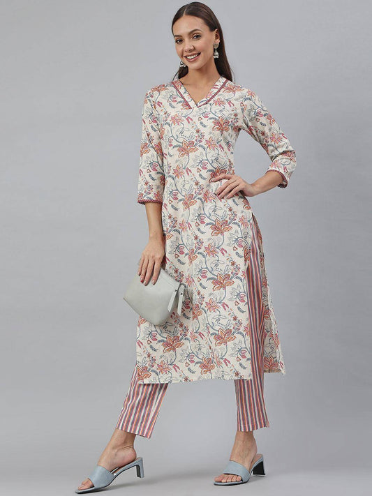 Off-White Cotton Printed Kurta with Pant