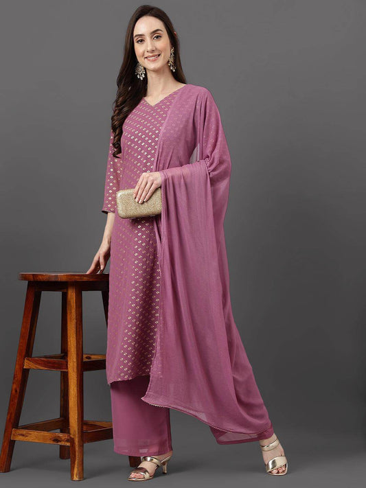 Purple Georgette Foil Print Kurta with Palazzo and Dupatta