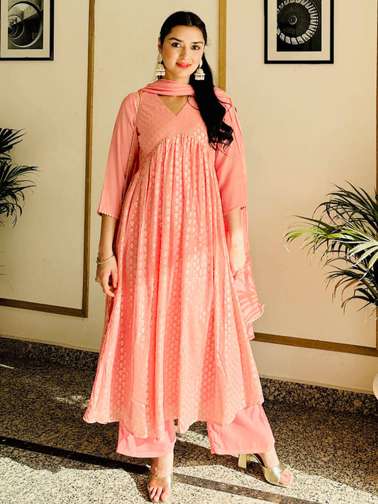 Peach Georgette Foil Print Kurta with Palazzo and Dupatta