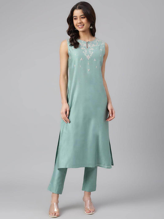 Sea Green Chanderi Silk Solid Kurta with Pant