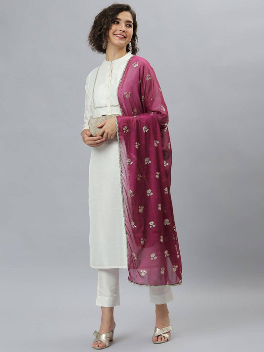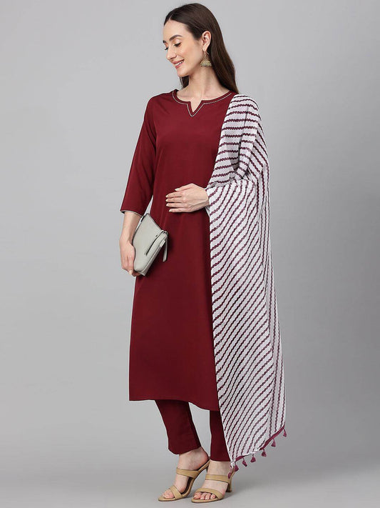 Maroon Crepe Solid Kurta with Pant and Dupatta