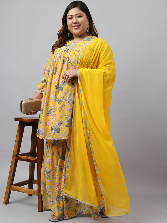 Women Plus Size Yellow Georgette Kurta Sharara Set