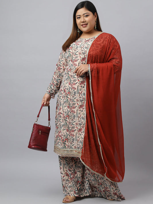 Rust Cotton Floral Print Kurta with Palazzo and Dupatta