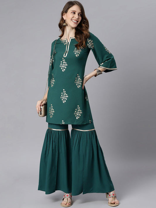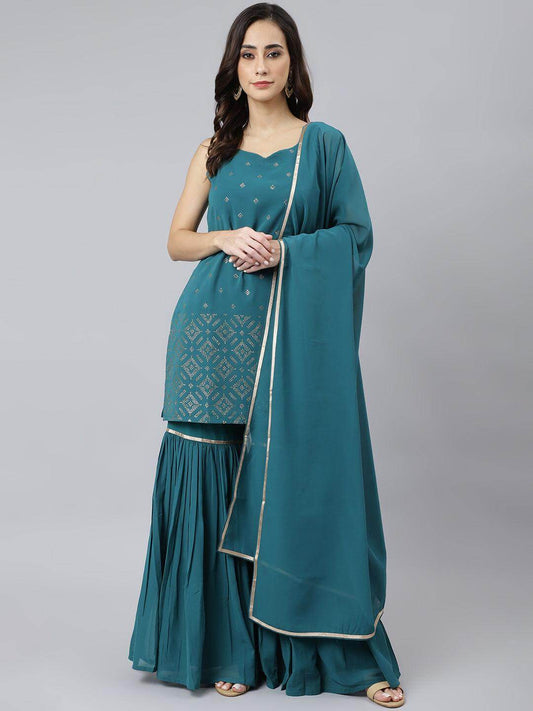 Teal Georgette Embossed Gold Print Top with Gharara and Dupatta