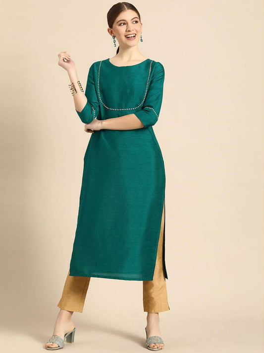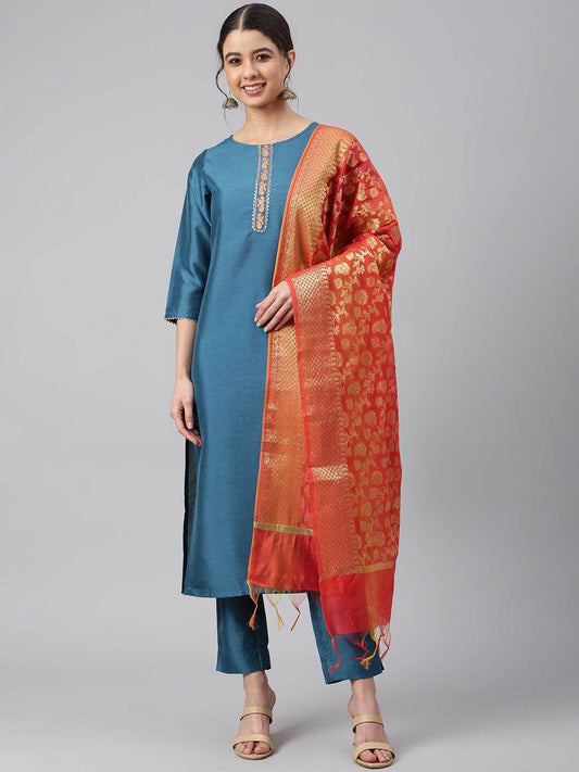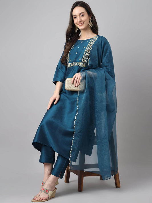 Teal Poly Silk Embellished Kurta with Pant and Dupatta