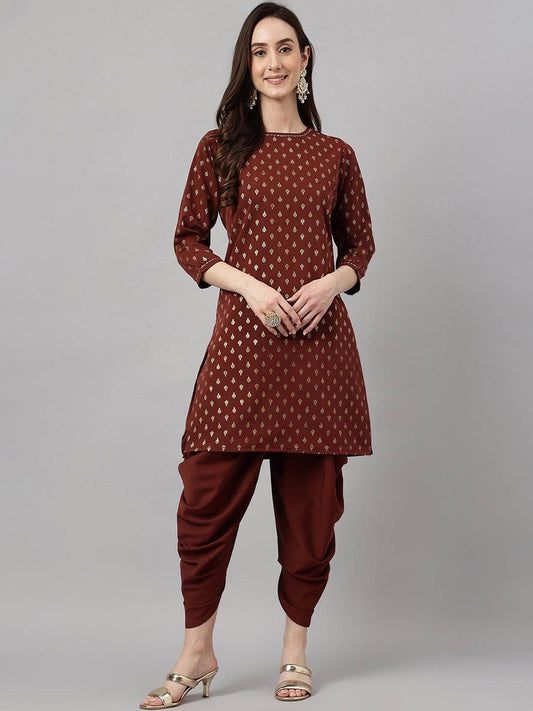 Women's Brown Crepe Foil Print Kurta with Dhoti Pant