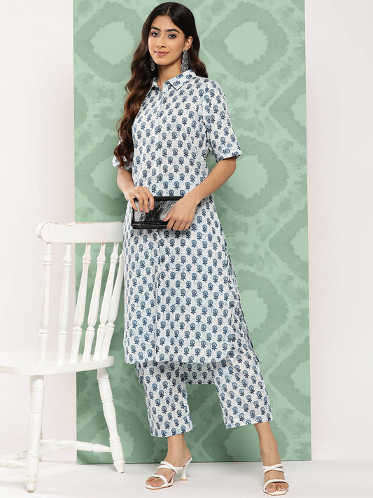 Women's Navy Blue Cotton Botanical Prints Kurta with Pant