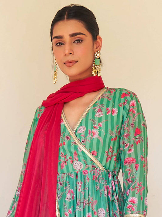 Elegant Green Floral Printed Green Kurta Set With Dupatta