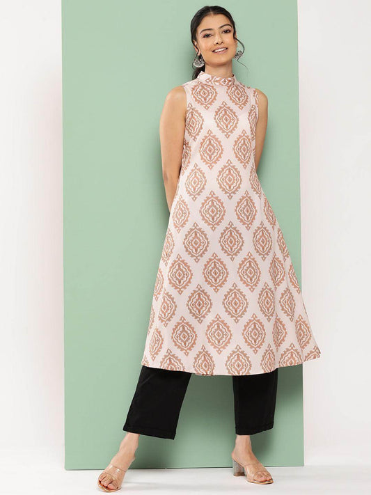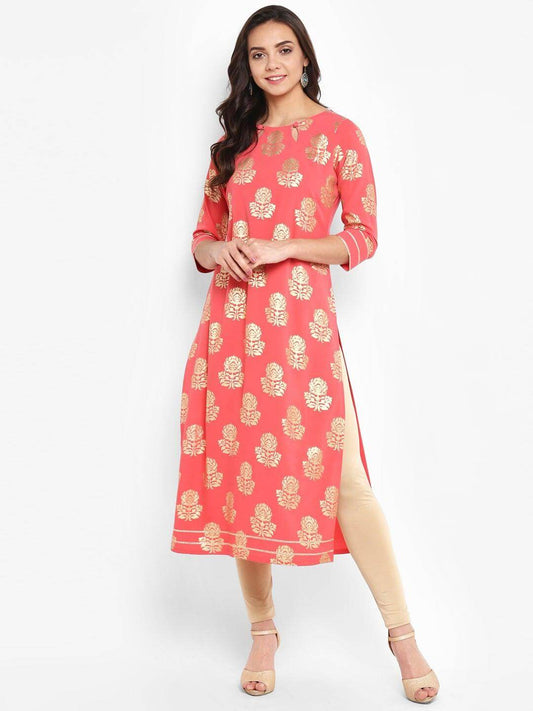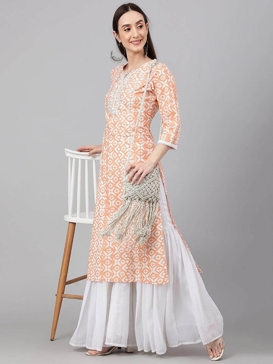 Peach Cotton Printed Straight Kurta