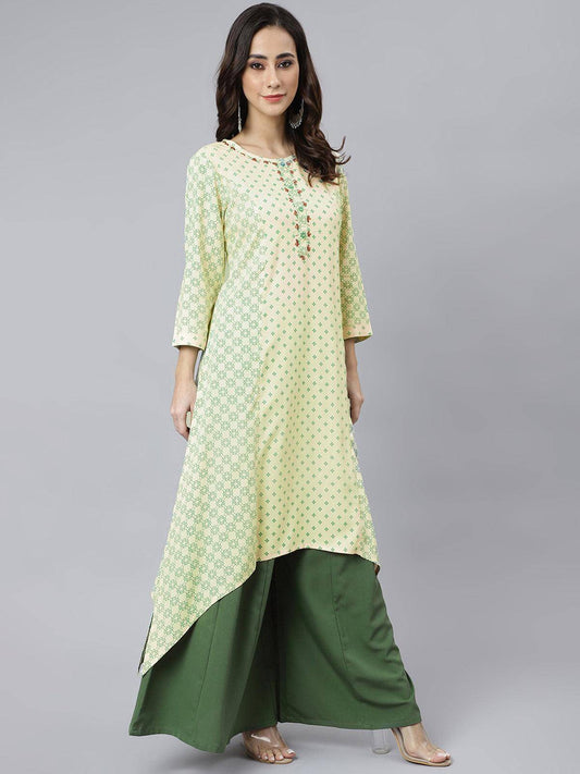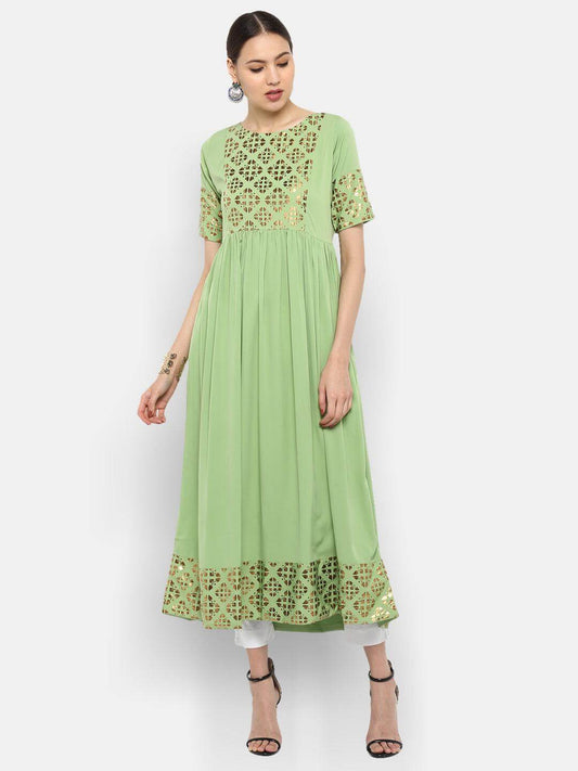 Light Green Poly Crepe Gold Print Flared Kurta