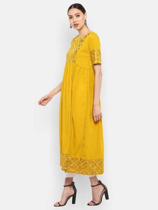 Mustard Poly Crepe Foil Print Flared Kurta