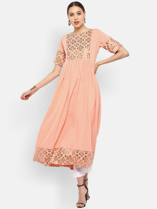Peach Poly Crepe Gold Print Flared Kurta