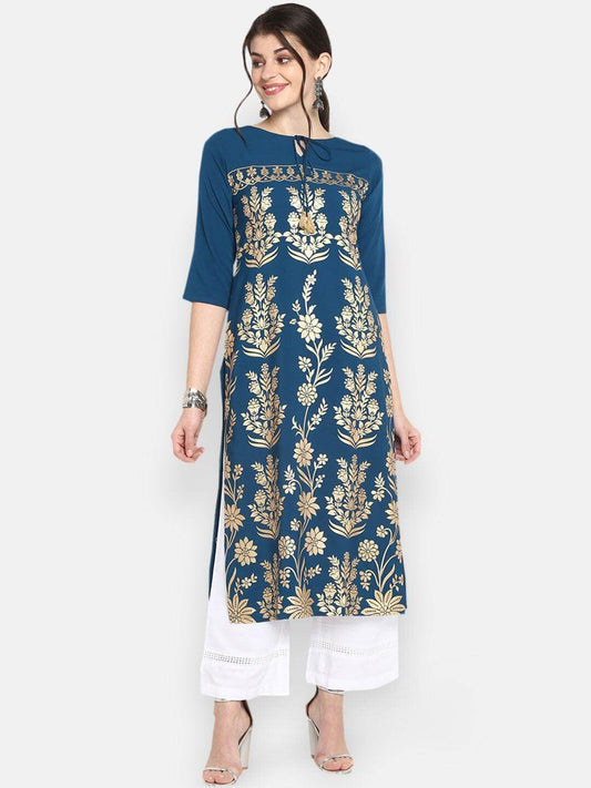 Teal Blue Poly Crepe Gold Print Straight Kurta