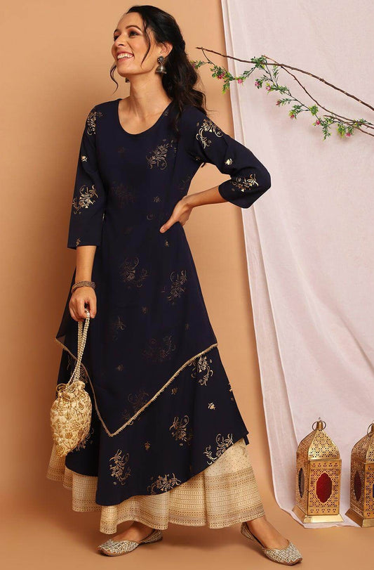 Navy Blue Poly Crepe Floral Print Flared Kurta