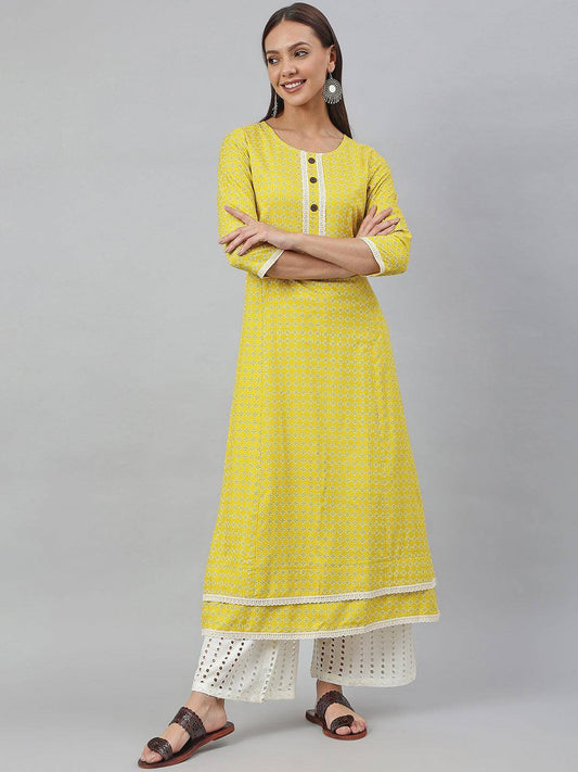 Yellow Rayon Botanical Print A-line Kurta