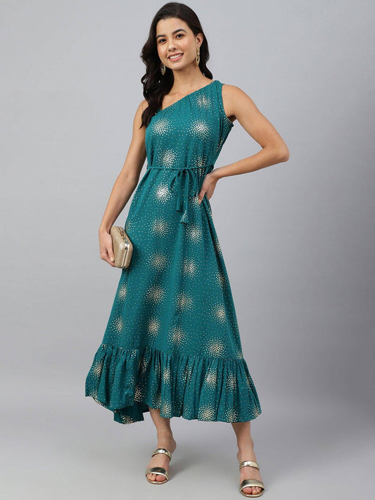 Teal Green Poly Crepe Printed Flared Kurta