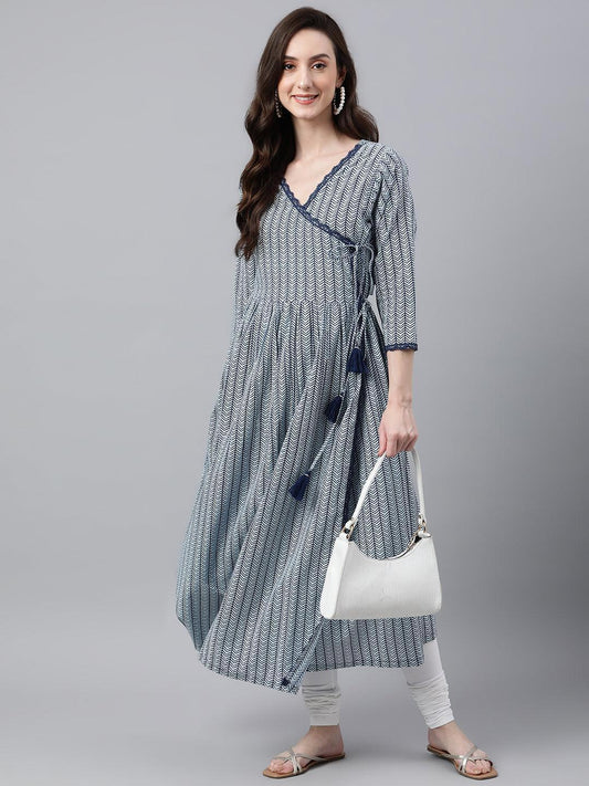 White Cotton Chevron Block Print Angrakha Kurta