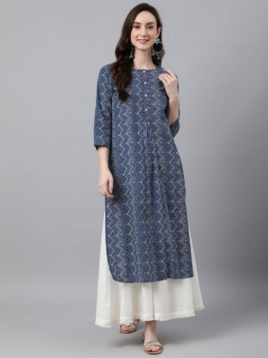 Indigo Cotton Zig Zag Print Straight Kurta