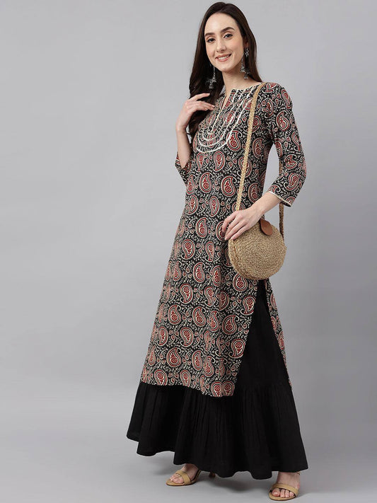 Women's Black Cotton Paisley Straight Kurta