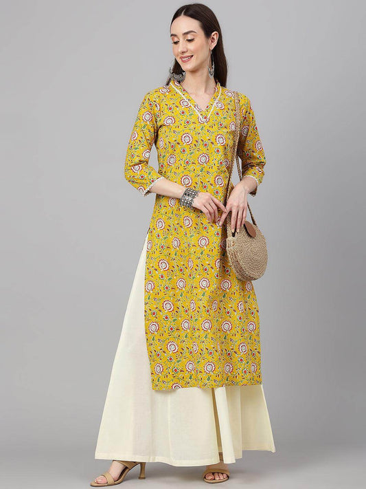 Mustard Cotton Floral Print Straight Kurta