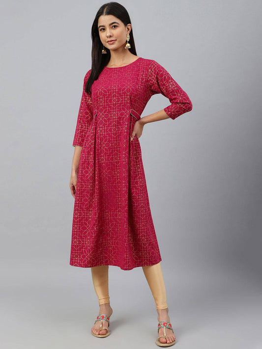 Wine Poly Crepe Foil Print Flared Kurta