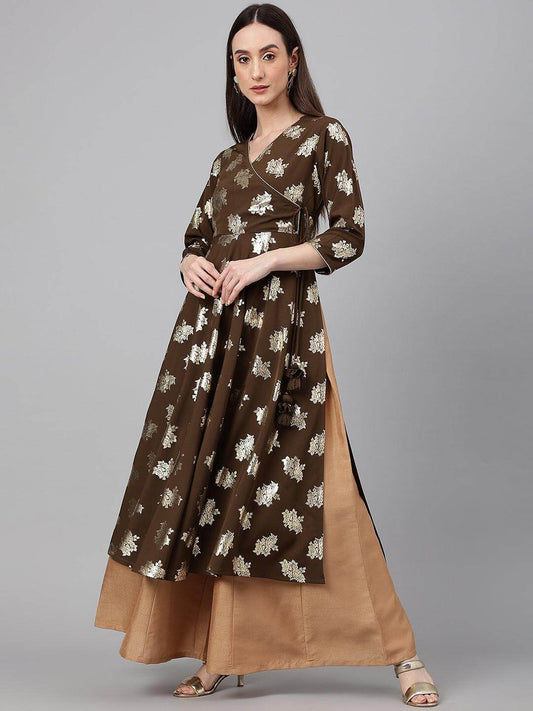 Olive Crepe Foil Print Angrakha Kurta