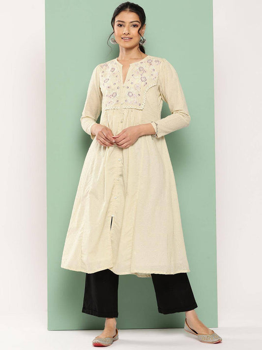 Off White Dobby Cotton Solid A-Line Kurta