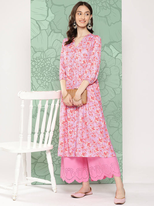 Lavender Moss Digital Floral Printed Gathered Kurta