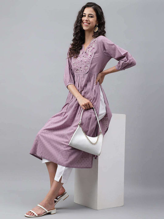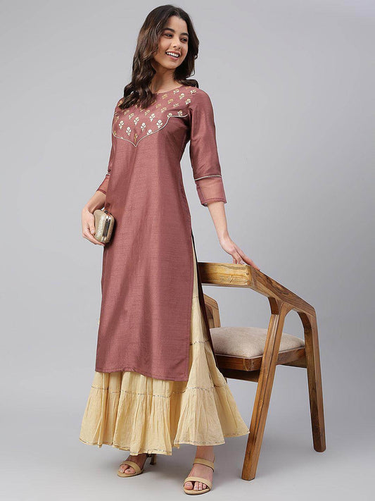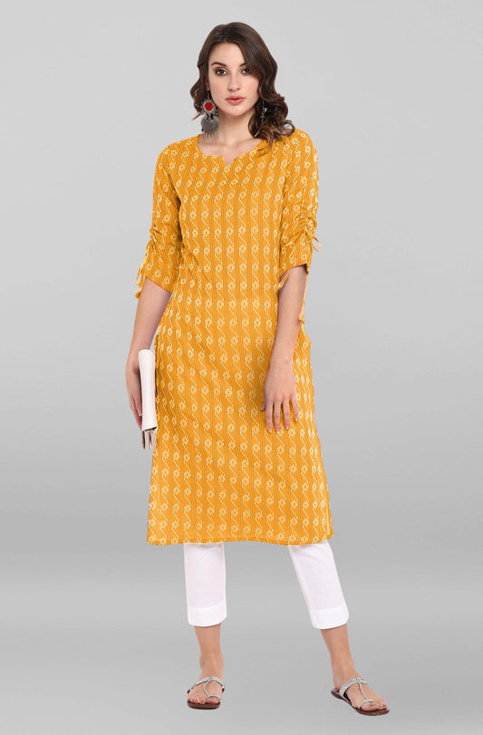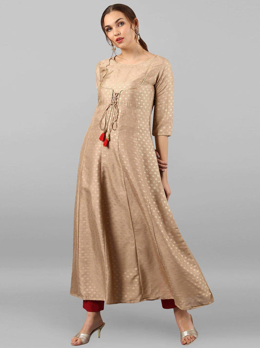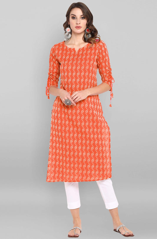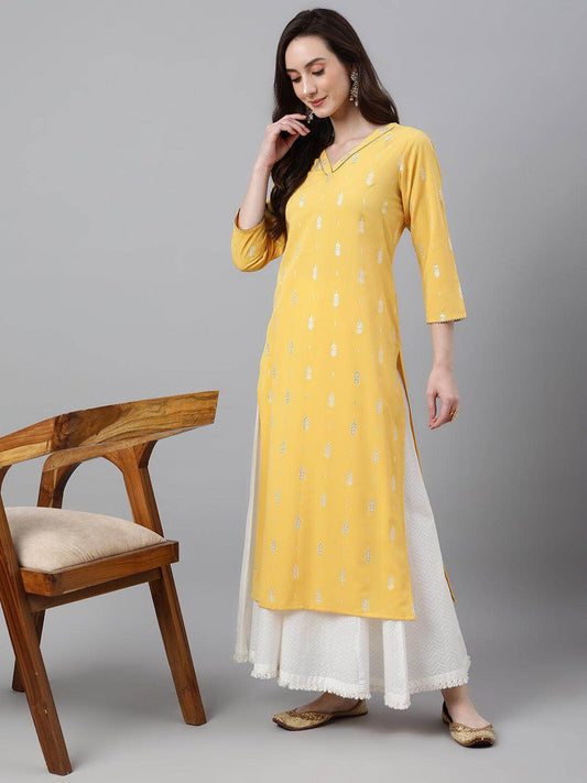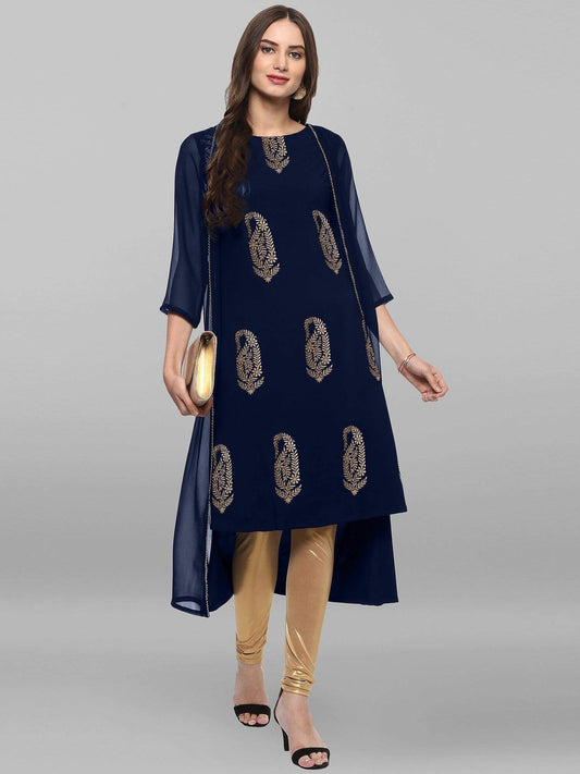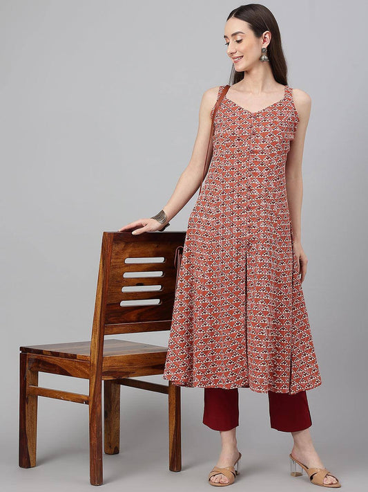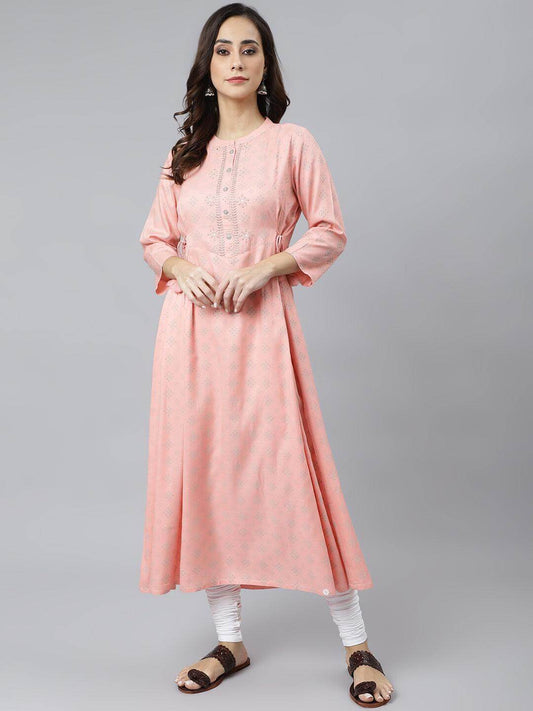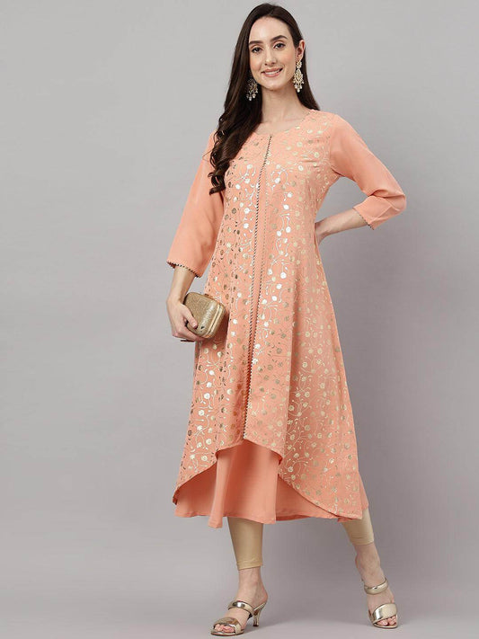 Women's Peach Crepe Foil Print Frontslit Kurta