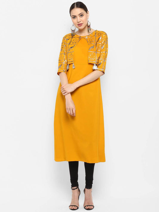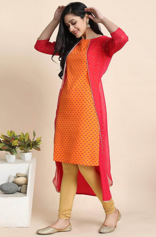 Orange Poly Crepe Floral Print A-Line With Attached Jacket Kurta